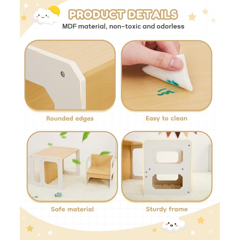 - Safety and Stability: The toddler table and chair set feature rounded corners to avoid sharp edges, reducing the risk of injury to children. Made of MDF material, it is safe, non-toxic, and has a smooth surface that is easy to clean,suitable for children aged 3-7