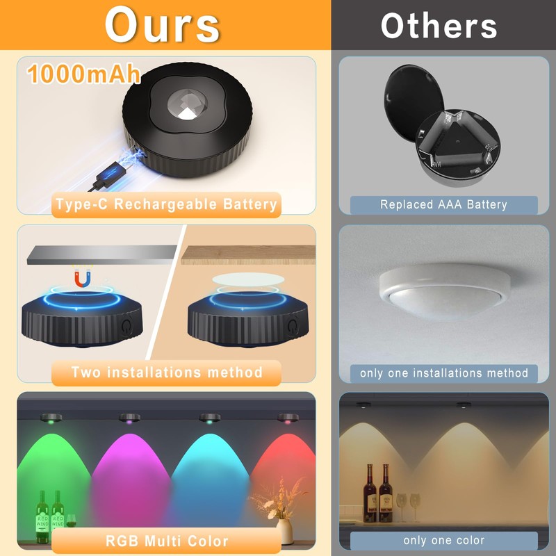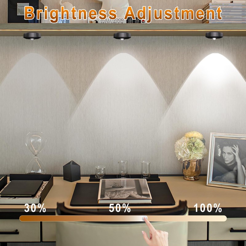 - 2 Control Methods and Timer Setting - The under cabinet light has two control methods, one is touch control and the other is remote control. Short touch the on/off key three times, corresponding to white light/yellow light/off respectively. Long touch for brighter and dimmer. Use the remote control to adjust other colors, modes and brightness of the puck light. There is a timer function on the remote, you can set the push light to turn off automatically after 15, 30, 60 minutes