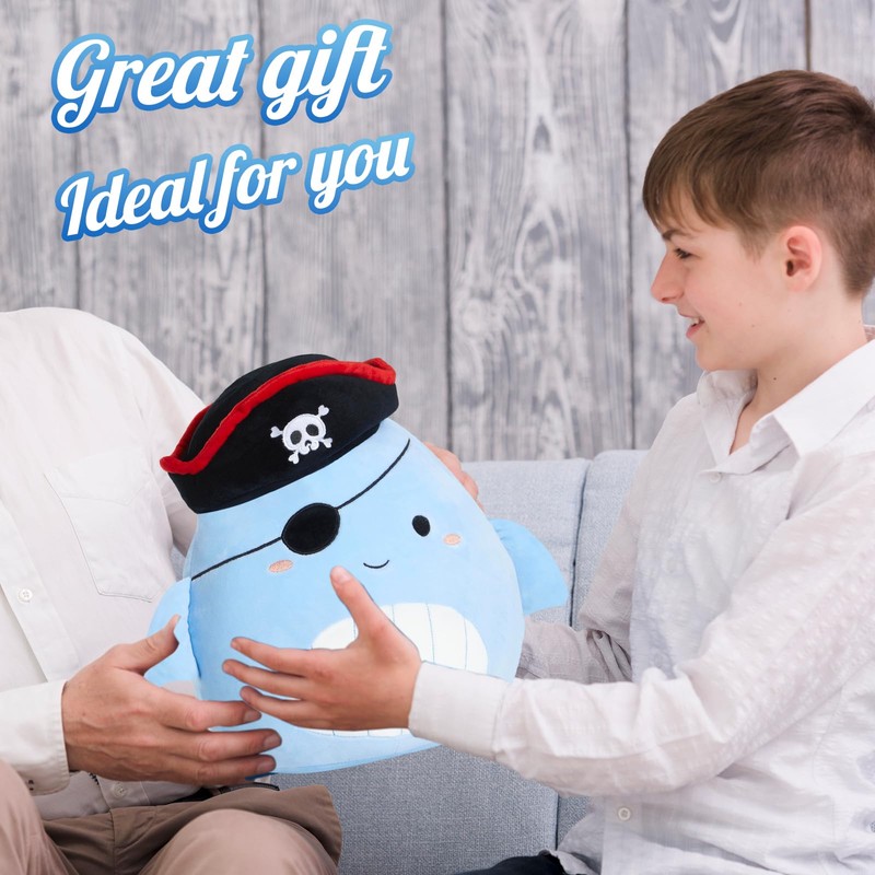 - 【Plushy & Squishy】The cute whale stuffed animal is well stuffed, so it is super soft and squishy. This pirate whale pillow is an adorable accompany when you are reading, lying, sleeping. Our whale plush is also an adorable gifts for Birthday Easter Christmas.