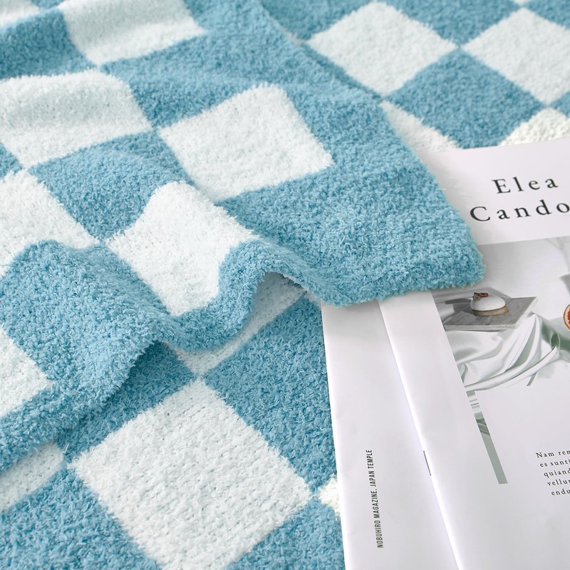 Cozzenity Checkered Throw Blanket, Light Blue Soft Cozy Fluffy Knitted Throw Blankets for Couch, Sofa, Bed, Chair, Warm Fuzzy Travel Picnic Lightweight Plaid Blanket, 50x70 inches