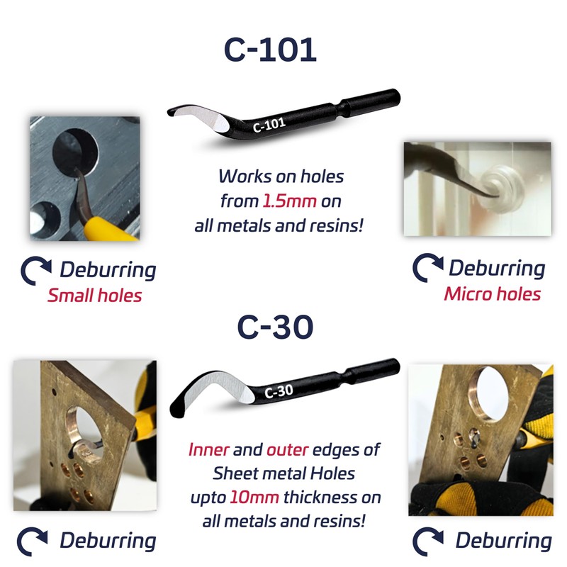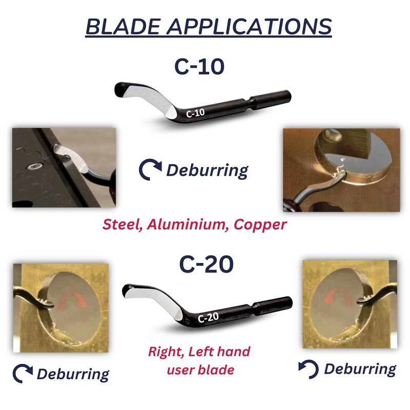 - 5 MULTI-VARIETY HSS STEEL DEBURRING BLADES: The C-10 is a Universal Deburring blade for right hand users and works best on Steel, Aluminium, Copper and Plastics. The C-20 blade is meant for both right and left hand users and works best on Brass, Cast Iron and Plastics. The C-101 blade is meant for right hand users for deburring on small, micro holes and works well for deburring on all kinds of materials. The C-30 blade is also a right hand user blade for deburring on the front and back sides of holes upto 10mm thickness. The C-101 blade is meant for right hand users for deburring on small, micro holes whereas the C-15 blades works best on Stainless Steel components.
