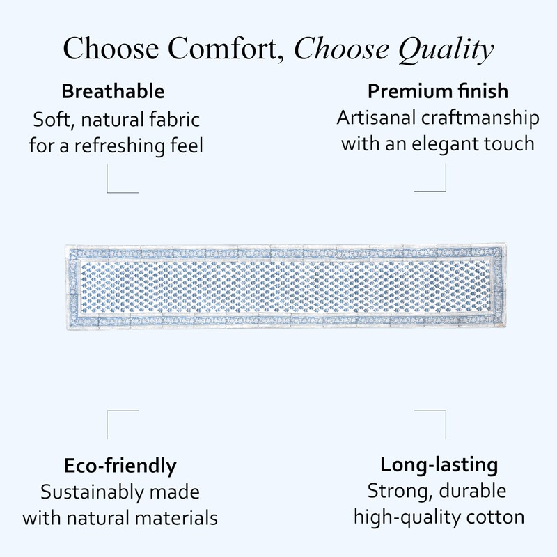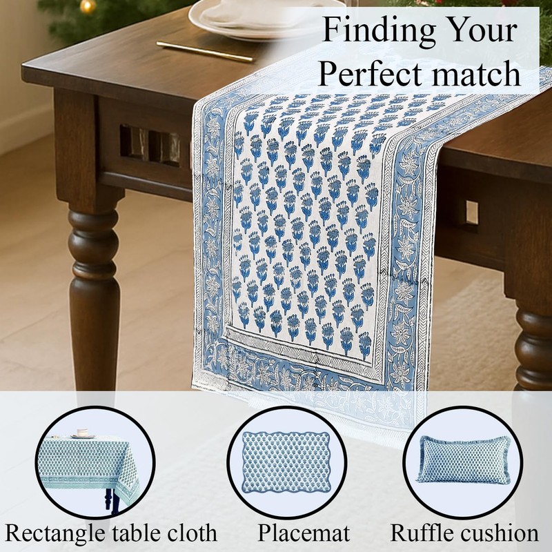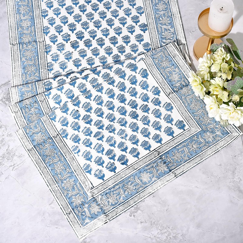 - EXQUISITE CRAFTSMANSHIP: Experience the artistry of India with our Cotton Print Club Apatite Blue runner, featuring a stunning blue floral design crafted using traditional hand-stamping techniques. Measuring 16x90 inches (40x228 cm), it can sit perfectly on 4 seater to 8 seater.