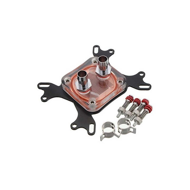 - It has two chrome plate Copper faucets. The external diameter is 10 mm. The height of the copper base is 5 mm. It has inner water channel. The water contact area is large, thus to carry more heat from the CPU quickly.