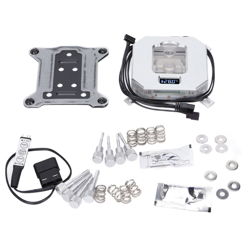 1、High Quality Material: Brass, copper, acrylic, sturdy and durable, good heat dissipation. 2、RGB Lighting: Brilliant and colorful, indicating working status and reminding users at all times. 3、Equipped with Manual Controller: You can manually adjust the light, reduce heat, and make the computer CPU run normally. 4、Water Block with Temperature Display: The product integrates digital temperature display, customers can intuitively monitor the temperature of the system. 5、Easy to Install: This heat dissipating computer holder has precise holes and is compatible for Intel 115X/2011/2066.