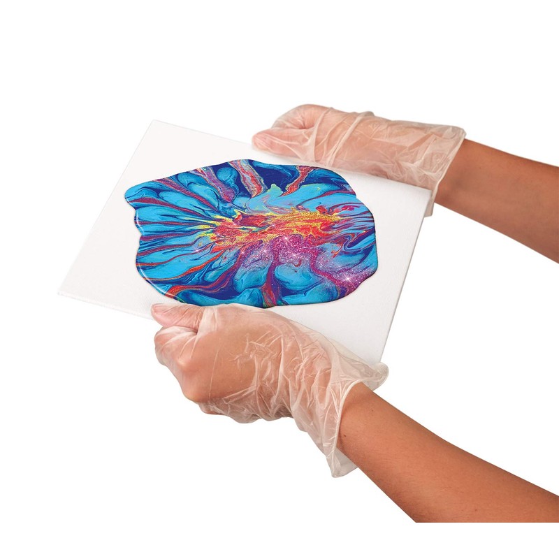 - Layer and pour acrylic paint on canvas creating marbled designs!