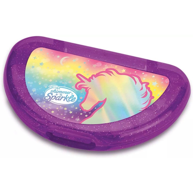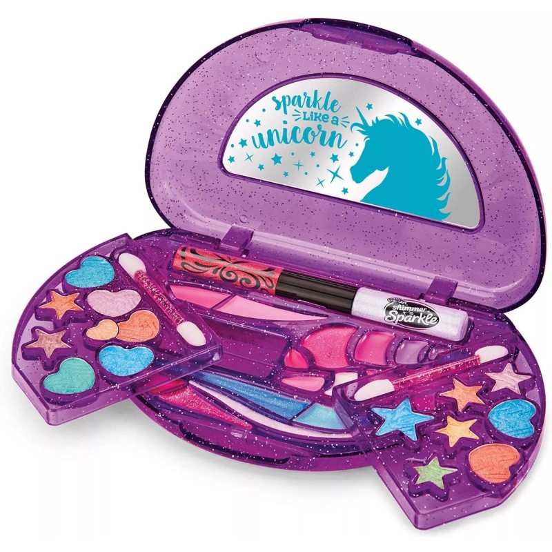 The Shimmer 'n Sparkle All in One Beauty Compact is perfect for all young makeup artists. The Unicorn Dreams Ultimate Makeup Compact comes packed with a collection of totally dreamy colors. The Shimmer 'n Sparkle All in One Beauty Compact comes with over 30 colors for cheeks, lips and eyes. Take your makeup style anywhere, it's the perfect palette for On-The-Go. Use the eye shadow and lip gloss to create unicorn like makeup. This makeup kit holds the best beauty in one super-stylin' glittery purple compact. The lid of the compact has a beautiful rainbow unicorn picture on it and when you open the lid you'll see a variety of 15 colorful eye shadow colors that are in heart and star shapes. Next, slide out the eyeshadow trays to reveal 15 shimmery lip colors and 2 cheek colors. Shimmer 'n Sparkle All in One Beauty Compact set it is great for gifting, as an activity for sleepovers and play dates, or even after school fun! The Shimmer 'n Sparkle All in One Beauty Compact comes with 1 makeup compact with mirror, 15 lip colors, 15 eye shadows, 2 cheek colors, 1 tube lip gloss, 4 applicators, and instructions. The Shimmer 'n Sparkle All in One Beauty Compact is a great for fashionistas ages 8 and up.