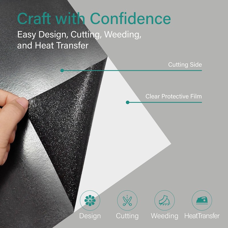 - [UNLEASH YOUR CREATIVITY] Get ready to explore endless possibilities with Crab premium HTV roll, measuring 12” x 5ft (30.5cm x 152cm). Made of Glitter material, the vinyl ensures durability and excellent results. Now, follow these six simple steps: 1. Design and cut. 2. Weed the design. 3. Preheat your heat press or iron. 4. Apply gentle pressure and heat at 293°F~302°F (145°C~150°C) for 15~30 seconds. 5. Peel the carrier sheet. 6. Allow cooling for a masterpiece that's bound to impress!