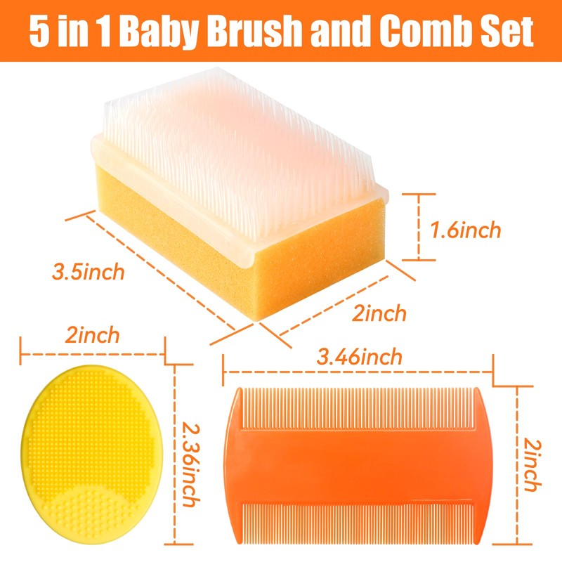 - 5-in-1 Baby Brush and Comb Set: This set includes 2 x soft bristle and sponge brushes, a dual-sided comb, and 2 x silicone cradle cap brushes, which can keep your newborns and toddlers in well groomed while ensuring comfort