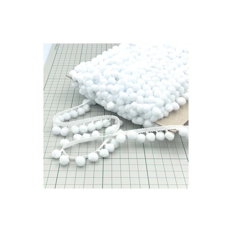 - This is a small/medium pom pom trim with an overall width of approximately 18mm, supplied on a 25m card. The bobble ball is around 9-10mm in diameter. They are well spaced with approx. 90 pom poms per metre