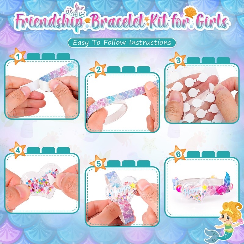 - 👭【Friendship Bracelet Making Kit for Girls 】The Charm Bracelet Making Kit is filled with acrylic bracelets*8,glitter strips*8,double-sided adhesive dots*2(64 dots), pretty charms*50(cute mermeid accessories). Girls will love making these adorable mermeid bracelets gifts bracelets, which they can customize as they like. The friendships of 6-10-year-old girls will also deepen when they make these bracelets making kit.