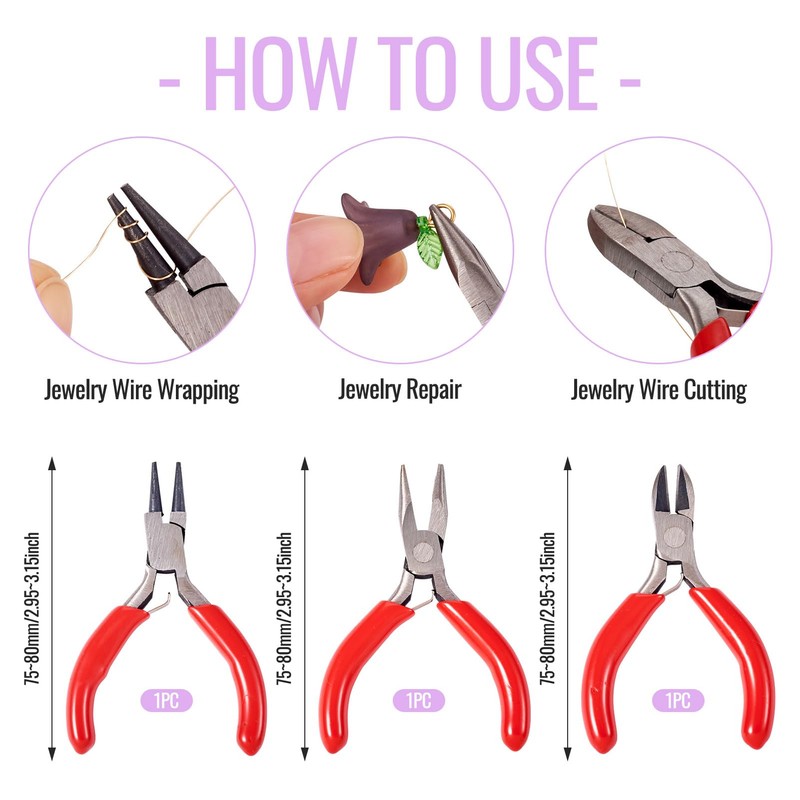 - Pliers Includes: This mini pliers set includes 75 mm flat nose pliers, 75-80mm side cutting pliers, 75-80mm round nose pliers, each 1 pc