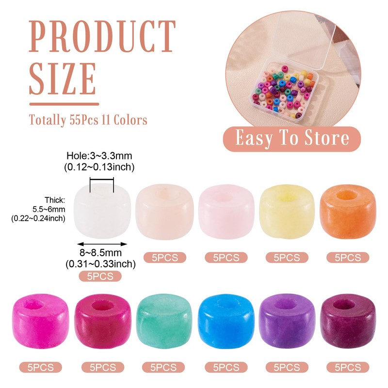 - Package Include: You will received 55pcs beads (11 color,5pcs/color),Size: about 8-8.5mm in diameter, 5.5-6mm thick, hole: 3-3.3mm