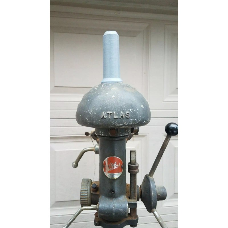 Complete your drill press!  Nearly all of the classic 15" Atlas drill press's out there are missing this dust/dirt cover.  I lucked into one and have as near a reproduction in ABS plastic as possible.  The hole in the top of your front guard should be 1.750" ( 1-3/4") for this cover to fit.  It may fit other sizes of Atlas or other brands of drill presses.  However I do not own those to measure. If your front pulley/belt guard has been painted many times, the hole could be filled with layers of paint, you may need to scrape some out to get a proper "smooth but snug" fit.  The part should slip in with light pressure.  Do not strike with any object.
