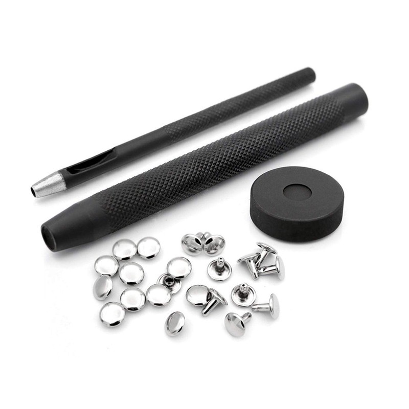 - Fixing tool for double cap rivet. The set includes Rivet Setter (driver) + Metal block for bottom cap + Hole Cutter + 100 Silver double cap rivets.