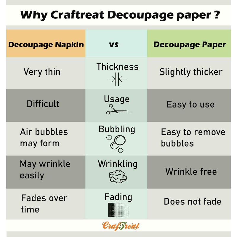 • CrafTreat's Decoupage Paper pertinently textured decoupage papers give wrinkle-free, smooth decoupage on a surface. Apply an even coat of glue. When it is slightly dry, place the decoupage paper and press. Take a sponge/cloth and move it uniformly in one direction.