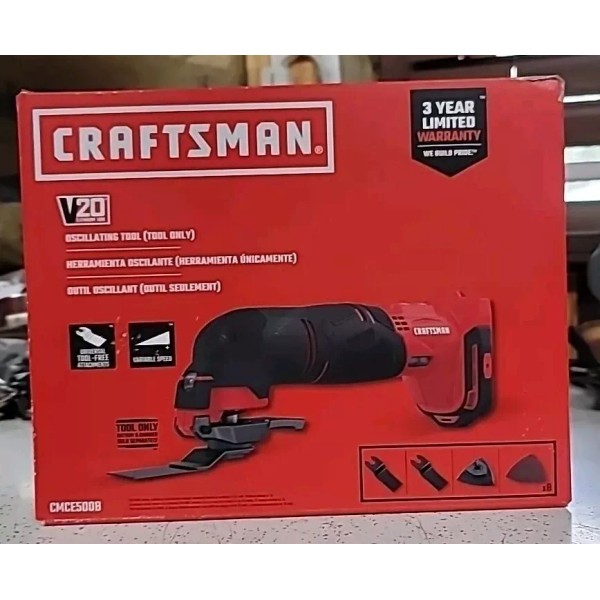 Introducing the CRAFTSMAN V20 Oscillating Tool CMCE500B Tool Only, **SEALED**. This powerful tool is perfect for any DIY project, with its 20V Lithium-Ion (Li-Ion) battery technology providing long-lasting power. The tool features an LED battery indicator, variable speed, quick release function, attachment included, and keyless chuck for easy use.