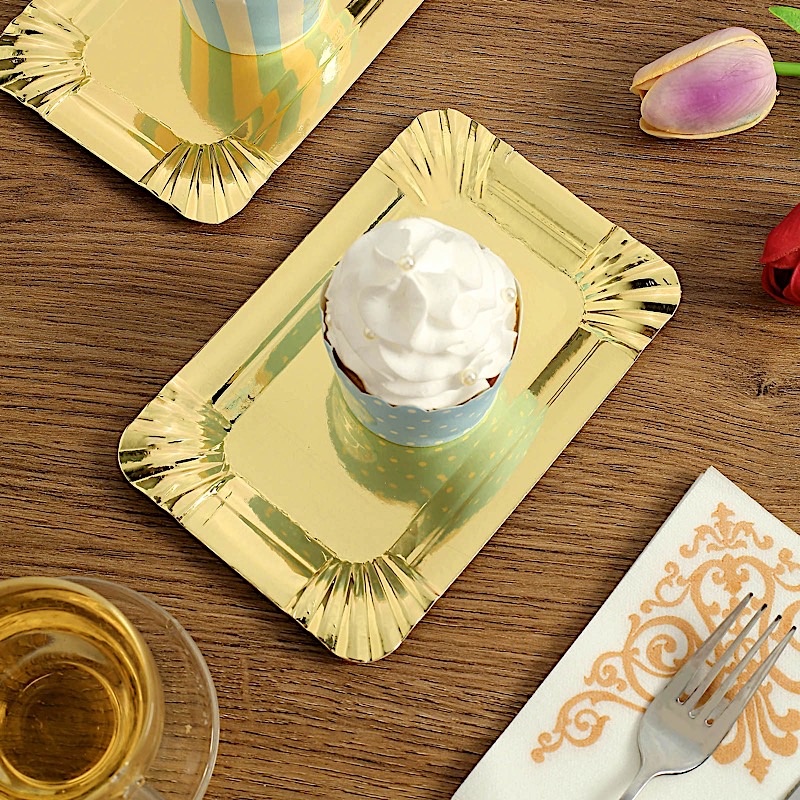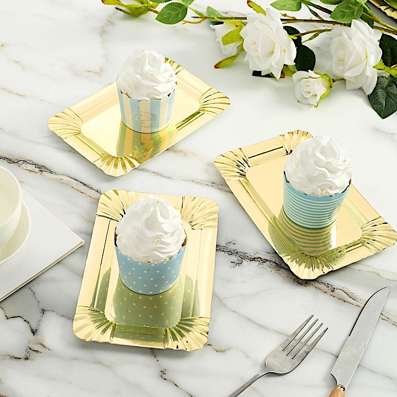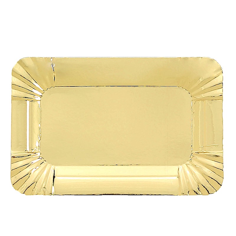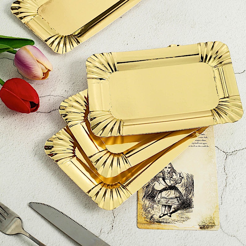 Accent your party tables with sparkling mini rectangular paper serving trays from Leilani Wholesale! Created from high quality cardboard with an elegant design and metallic finish these lightweight trays will enhance the look of your reception tables. Use these paper trays to serve your food, appetizers, cupcake, dessert and more. Perfect mini platters for parties, weddings, events or any special occasions. Make cleaning up a snap with these disposable paper serving trays!