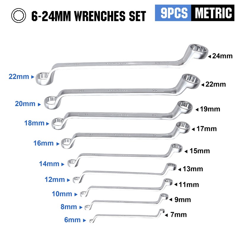 - 9-pieces premium wrench sets: Including metric ratchet sets 6x7mm, 8x9mm, 10x11mm, 12x13mm, 14x15mm, 16x17mm, 18x19mm, 20x22mm, and 22x24mm. Box end wrench set offers 2 sizes, making the entire set of ratcheting wrench feature maximum flexibility and portability. Ratchet wrenches have clearly marked size labels on both sides of the handle