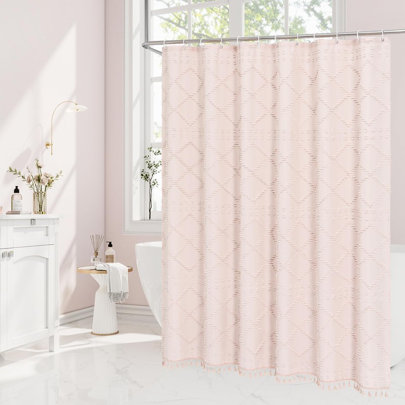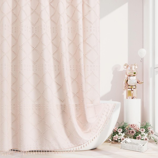 Craidlela Boho Light Pink Woven Fabric Shower Curtain with Tassel 72 x 72 Modern Farmhouse Minimalist, Pink Bohemia Tufted Chevron Striped Chic Textured, Waterproof Cloth Curtain for Bathroom
