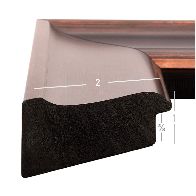 - Distressed bronze with copper edge and inlay; smooth finish with brushed appearance