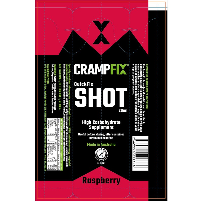 CrampFix contains a proprietary blend of Water, vinegar, sugar, salt, potassium (K), calcium (Ca), magnesium chloride, and natural lemon flavour. It is not intended to replace water, carbohydrate or electrolyte supplements; rather it is used to improve the way these necessities are utilised during moderate and high intensity exercise.