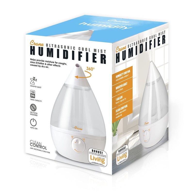 - LARGE ROOM HUMIDIFIER: Crane Drop Ultrasonic Humidifier features an easy-to-clean, detachable top fill tank that holds one gallon of water− perfect for humidifying indoor spaces up to 500 square feet for 24 hours