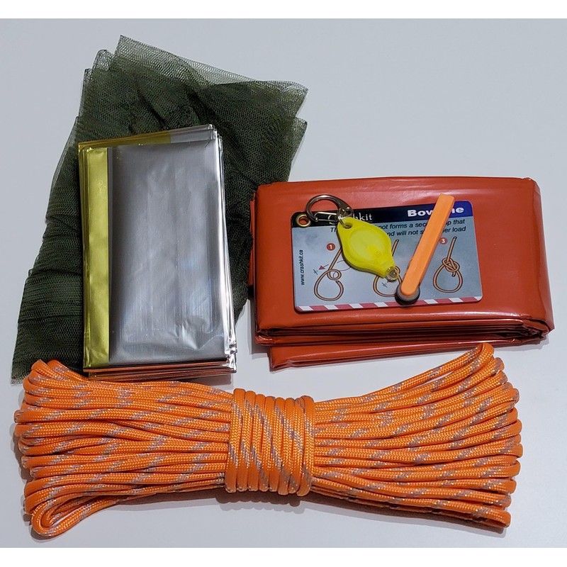 - Contains: 1 Sparklite SL-3-HO, 100' Firecord, 1 Crashkit Knotcard, 1 water-resistant LED, 1 Mosquito Headnet, 1 Emergency Bag, 1 Emergency Blanket