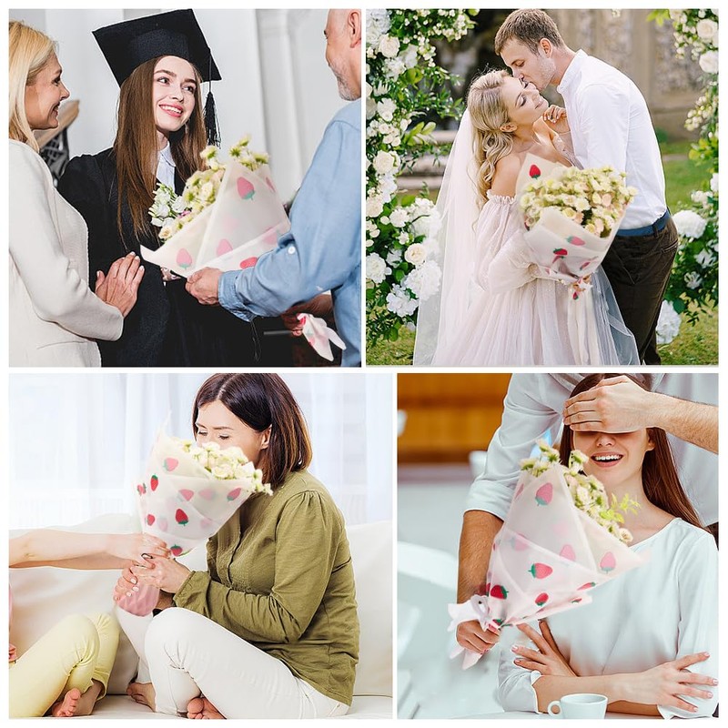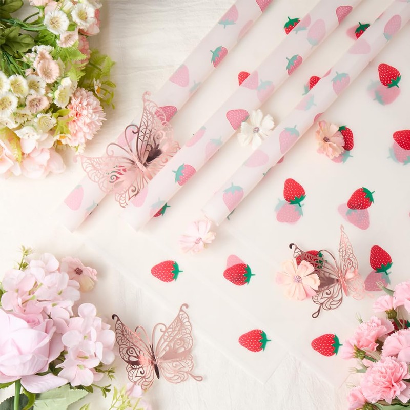 - STRAWBERRY FLOWER PACKAGING PAPER: Same color line design, white edge and cute strawberry pattern, making bouquet packaging lovely.