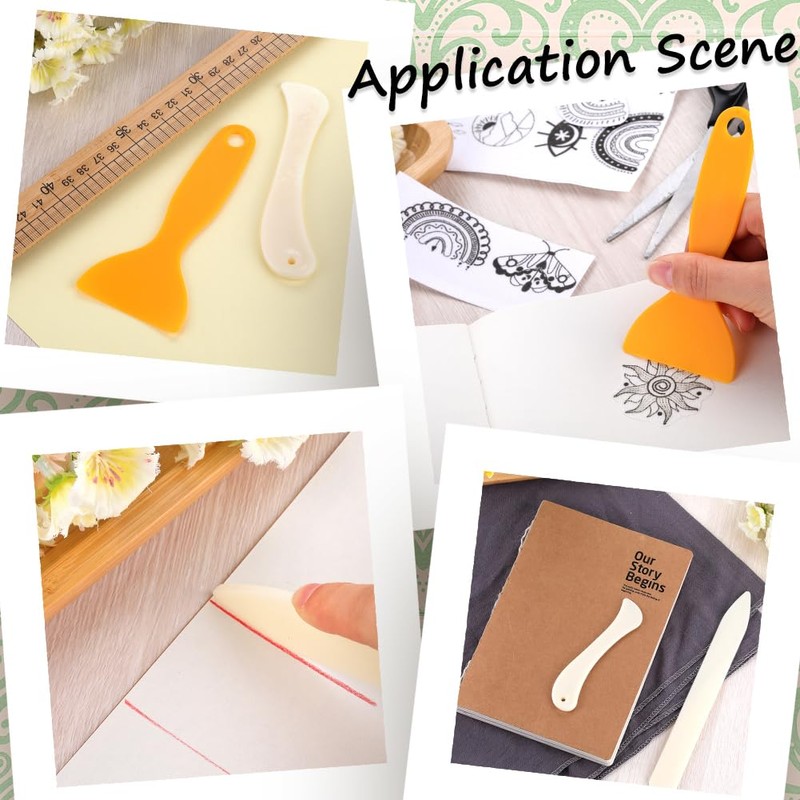 - Size: bone folders about 0.94~1.1inch (2.4~2.8cm) wide, 4.72~8inch (12~20.5cm) long, 0.19inch (0.5cm) thick, 2pcs/set, 2 sets. Plastic scraper tool: 0.49x0.22x0.01 inch(12.4x5.7x0.25cm), hole: 0.35 inch(9mm), 2pcs.