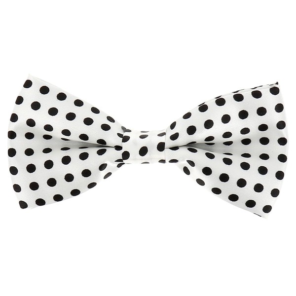 White and Black polka dots Bow Tie. Pre tied bow tie.Widht : 12cm. Height : 6cm. Material : Synthetic. Adjustable Straps : same pattern ribbon. Easy to close : metal hook.