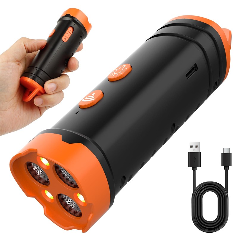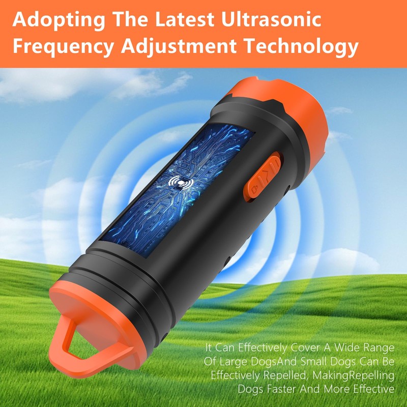 CRAYALIU 50FT Ultrasonic Dog Repellent, Portable Anti Bark Device with LED Lights, 3 Ultrasonic Transmitters, USB Charging, High Power Flashlight, Stop Barking and Biting, Dog Professional Training