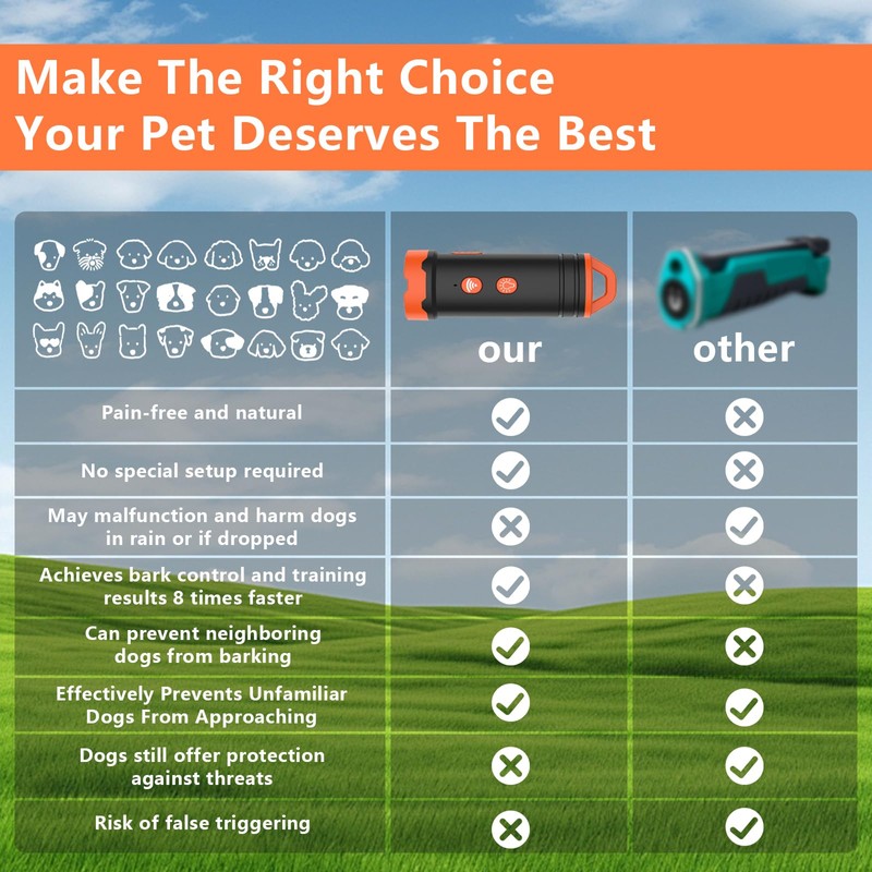 - An alternative to bark collars, shock collars, and bark whistles—painless and faster at correcting your dog’s behavior. We’re that confident you’ll love this advanced ultrasonic dog bark deterrent sleek, compact design, brilliant funcationality, rapid charging capability, and most important - how it helps your dog happily understand how to integrate into your family's life - without any shocking, frustration or pain!