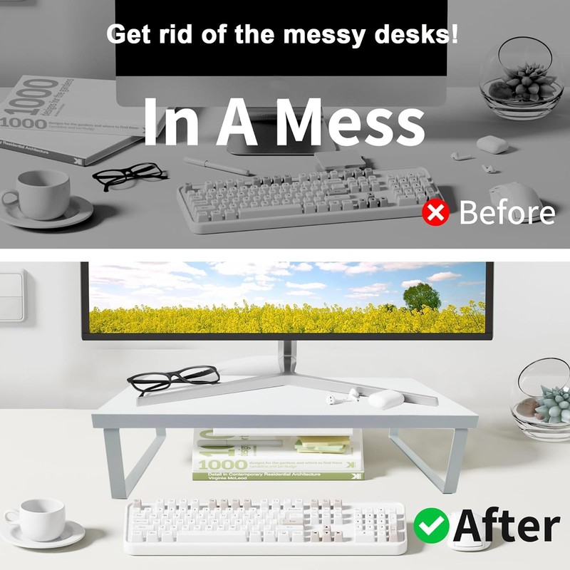 - 【Space Saving & Storage】Keep everything within easy reach and neat! Get rid of the messy desks! The monitor stand riser allows for organizing office supplies and accessories, adding hanging pen holders for easy access, making the work environment more efficient and tidy.