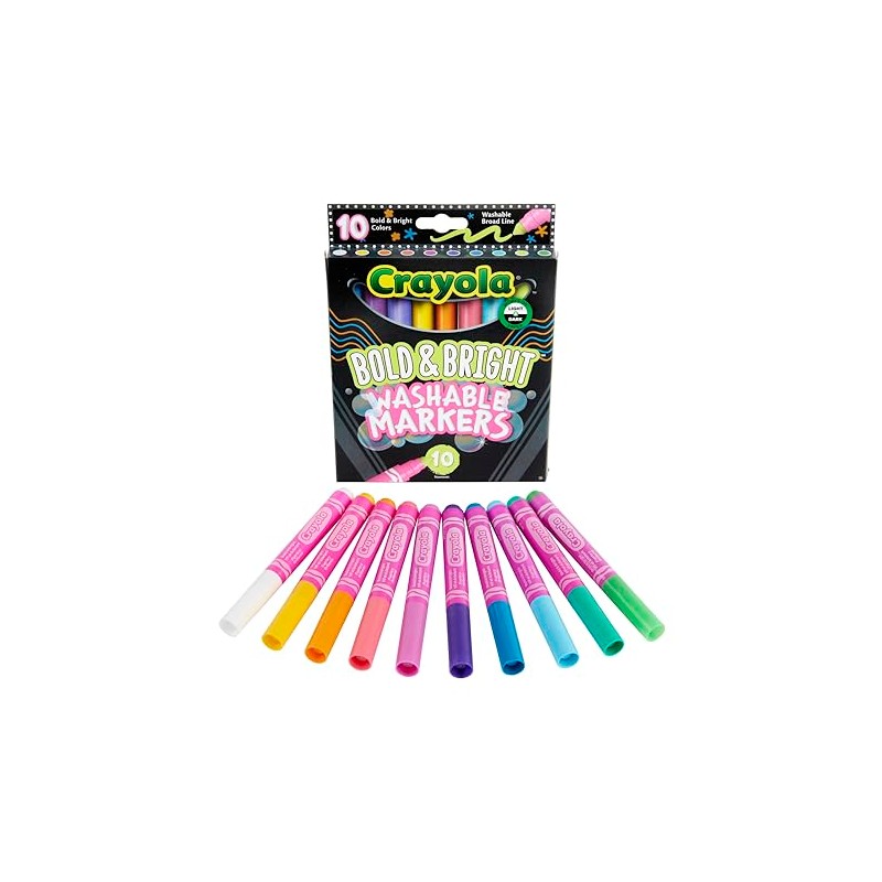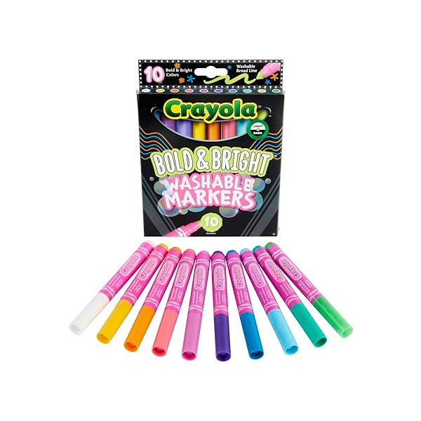 • BOLD & BRIGHT: These markers feature 10 Broad Line Markers in Bold & Bright Crayola colors that stand out on light and dark paper, making them perfect for creating eye-catching artwork.