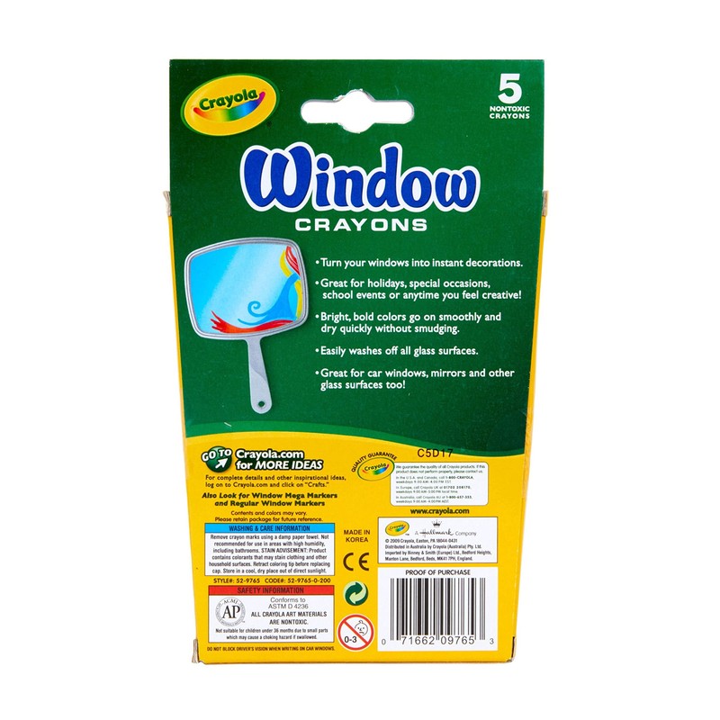 Easily washes off. Package contains: five window crayons. Nontoxic. Conforms