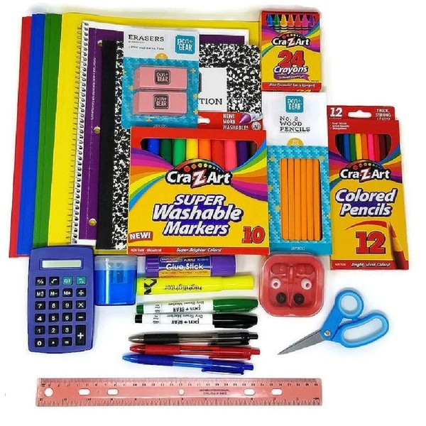Basic school supplies bundle includes 20 #2 pencils, 1 large glue stick, 10 Cra-Z-Art washable markers, 12 Cra-Z-Art colored pencils, 1 Smart Start Pencil Sharpener, 24 Cra-Z-Art crayons, 1 pair of wired e-circuit earbuds with case (color will vary), 3 Office Depot Ink Pens (1 black, 1 blue, 1 red), 2 large pink erasers, 1 70-sheet spiral wide ruled notebook, 1 wide ruled composition notebook, 4 2-pocket paper folders with center prongs/fasteners (red, yellow, green and blue), 1 pair of scissors (color will vary), 1 calculator (color will vary), 1 plastic ruler (color will vary), 2 dry erase markers (colors will vary), 1 yellow highlighter. Brand may vary.