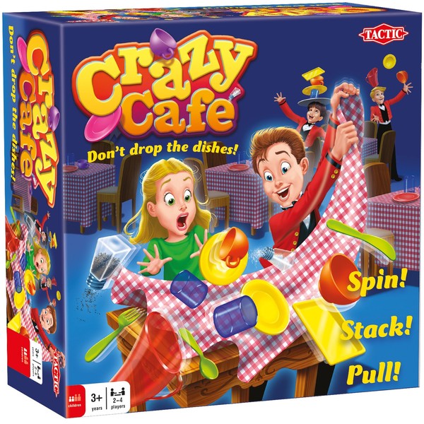 This exciting Crazy Caf game is fun for all the family! The aim of the game is to pull the tablecloth from under the dishes without making them fall. Each player spins the spinner and stacks the dishes on the table accordingly. When you land on pull you must pull the tablecloth as swiftly as you can so the dishes dont fly everywhere! If you successfully pull the tablecloth three times you are the winner! The dishes are made of sturdy plastic so they wont break and the bottom of the box doubles up as the table!