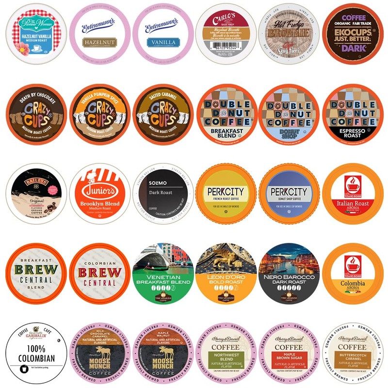 This sampler pack includes 30 premium gourmet single serve coffees from Marley Coffee, Cake Boss, Caffe Bonini, Crazy Cups, Double Donut, Martinson, Guy Fieri, Skinny Girl, EKOCUPS, and many other premium brands. Exact flavor assortment may vary subject to availability, however this variety pack will include every brand listed in this description. flavors may vary