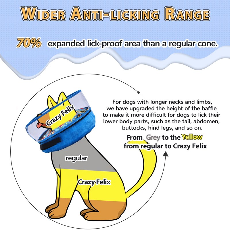 Crazy Felix Soft Enhanced Anti-licking Inflatable Dog Cone-Different from plastic pet cones, this soft dog recovery collar can make dogs feel comfortable when wearing it and don't hurt their skin. And the benefit of its expanded baffle design is that it prevents dogs from licking their wounds in any area, making it an exceptional choice for your furry companions during their recovery.
