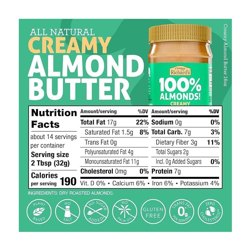 - Choose Better: Our zero-cholesterol, unsweetened, unsalted almond butter doesn’t contain Palm or Seed oil, or hydrogenated oil. Almonds are heart-healthy and full of vitamins, fiber and protein.