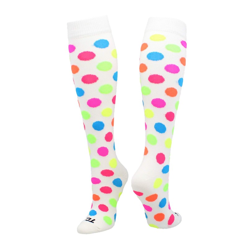 - FUN SPORTS SOCKS: Stand out on the field or court with these crazy neon polka-dot over the calf athletic socks. This style sock hits just below the knee making it a great choice for fashion, softball, volleyball, lacrosse, soccer, cheer, field hockey, fun runs and more!