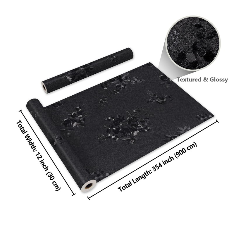 - ◀ Black Wallpaper Peel and Stick ▶ Size & Material: Black peel and stick wallpaper is 12"W by 354"L, each roll covers 29.5 square feet, made of high-quality vinyl, durable, strong, not easy to tear, waterproof, oil-proof, moisture-proof, dust-proof, scratch resistant, easy to clean, colorfast and long-lasting