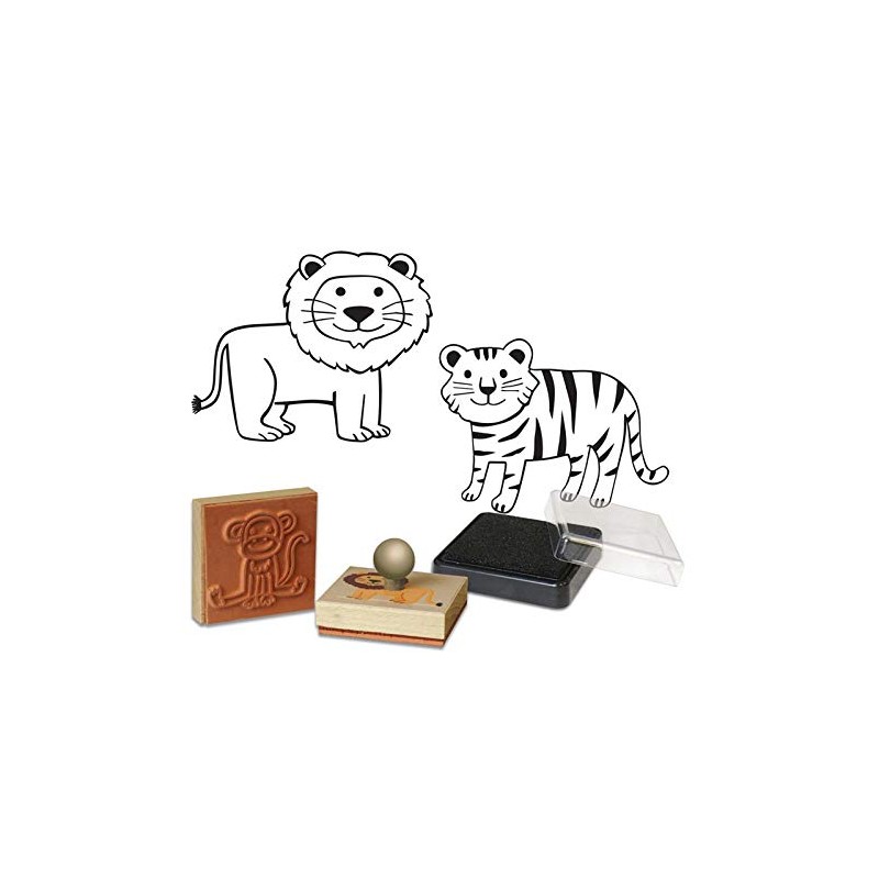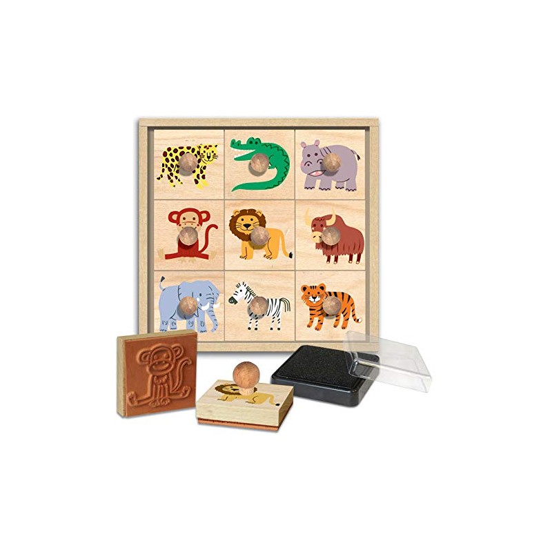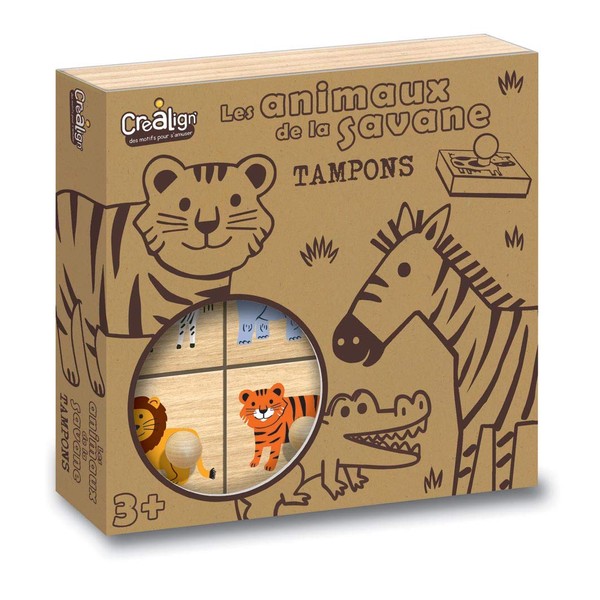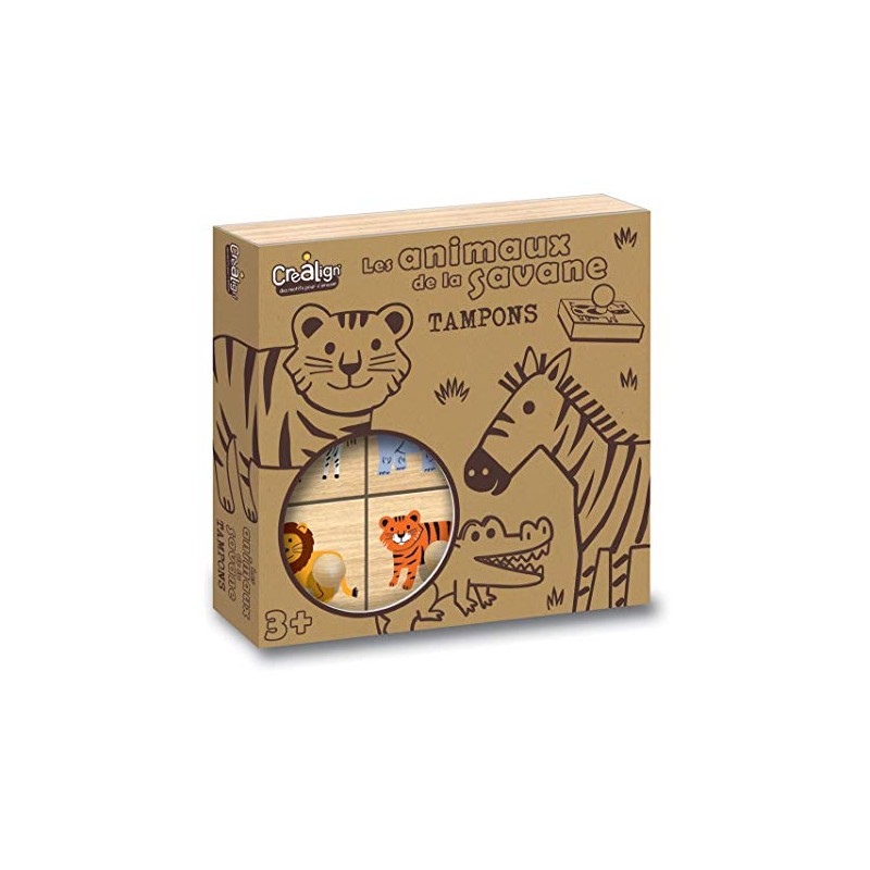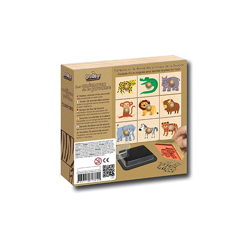 - The animals of the savannah: a wooden box for stamping the animals of the savannah. The screen printing stamps are equipped with a handle that makes it easier to hold. Children can create their own safari