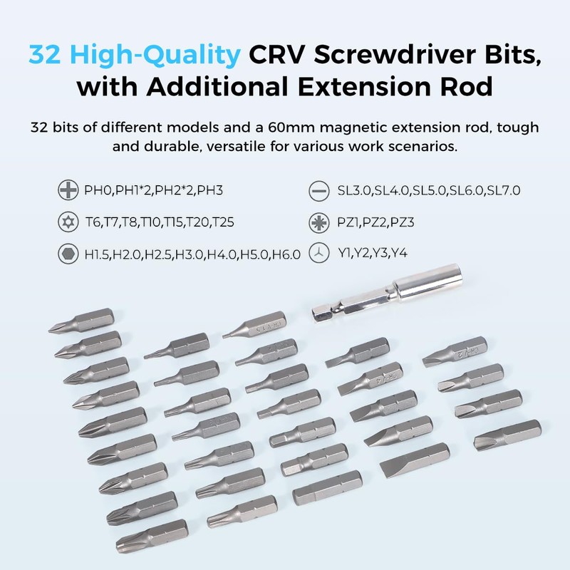 - 【32 CRV Screwdriver Bits】32 bits of different models and a 60mm magnetic extension rod, tough and durable, versatile for various work scenarios. Satisfy the installation and disassembly work of 3D printers and engraving machines