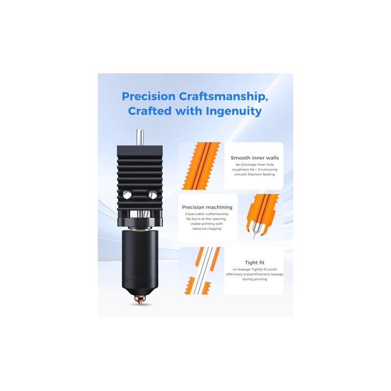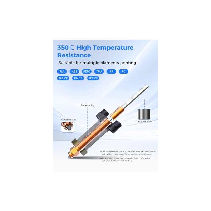- Upgraded Material: The heat break is made of titanium alloy, which reduces heat conduction The nozzle is composed of copper alloy and hardened steel, supporting the printing of various filaments such as PLA ABS PETG TPU PP PC PLA-CF PA-CF PET-CF.