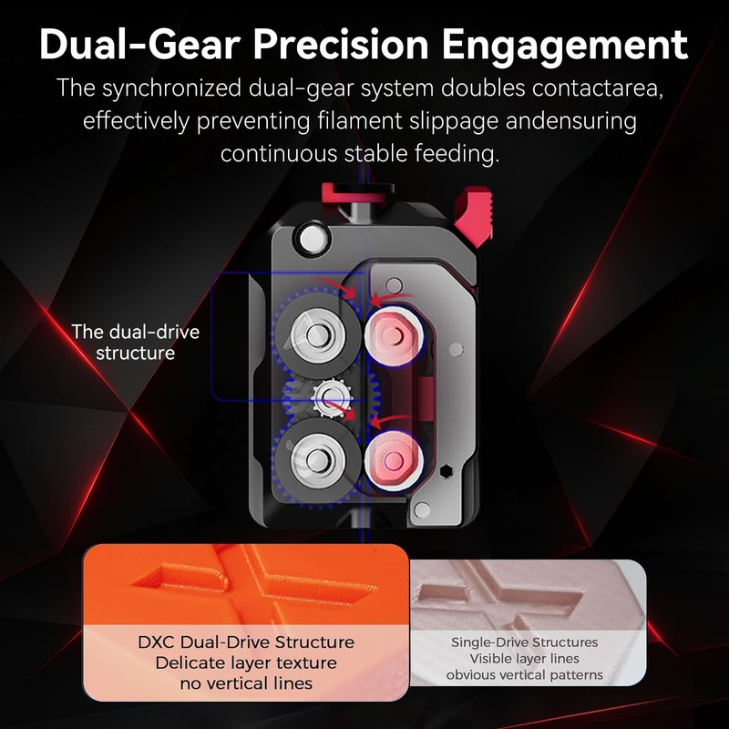 - 【Precision Feeding with Helical Gear + Dual-Drive System】: Featuring a helical gear design and dual synchronized gears, the DXC provides smooth, slip-free filament feeding. Compared to standard gears, it reduces filament wear by 60% and leaves minimal indentation, ensuring cleaner prints and stable extrusion even at high speeds.