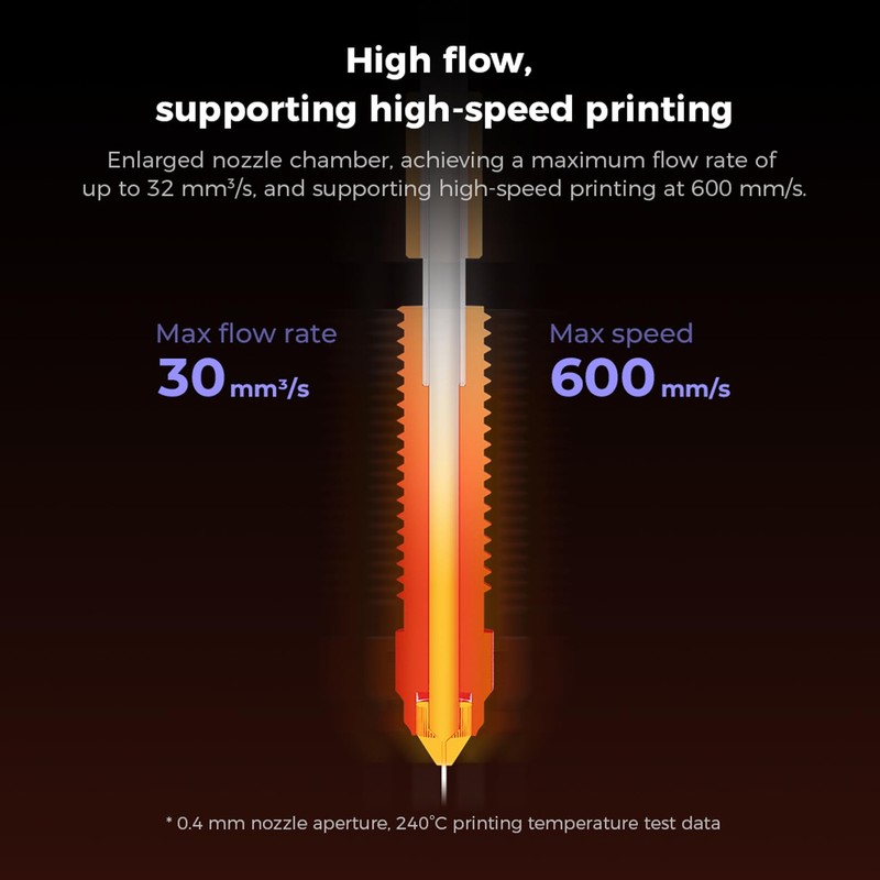• High thermal conductivity Even heating: The ceramic 360° circulation heater improves heating efficiency, ensures more even heating and faster heat transfer. Enlarged nozzle chamber that reaches a maximum flow rate of up to 32mm³/s and supports high speed pressure at 600mm/s.
