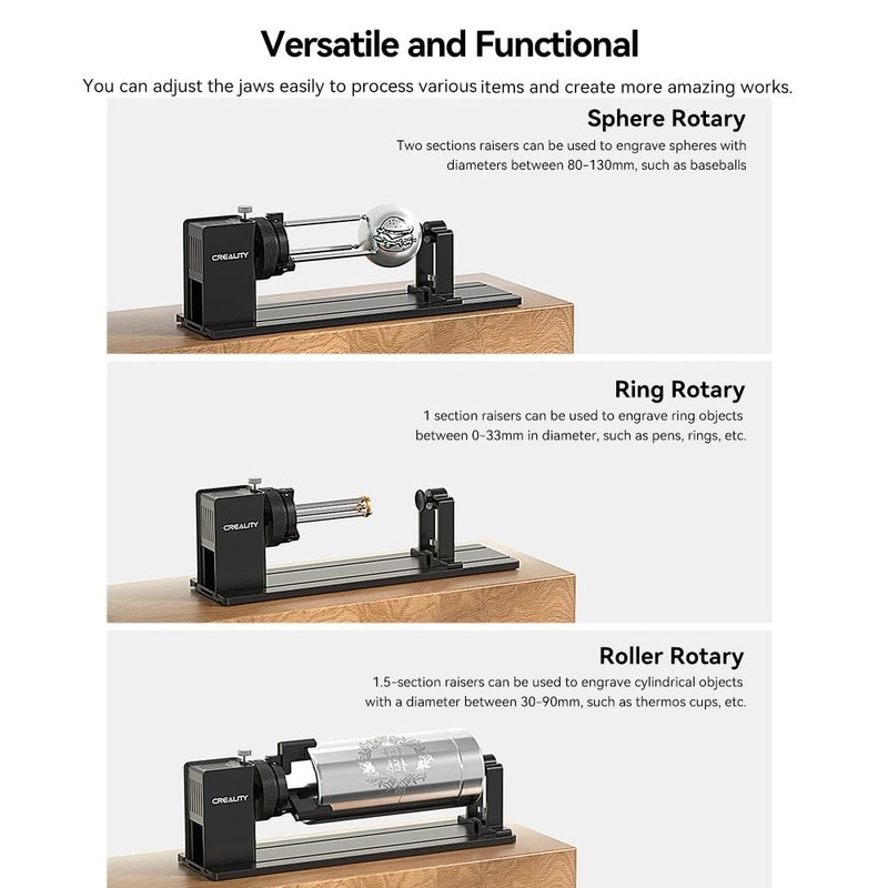 - 3 in 1 Rotary Roller Pro: The innovative 3-in-1 external jaws can be used for engraving work on many irregularly shaped items.Clamp from the outside:Suitable for cylindrical objects with a diameter of 1-110mm, such as: cans, thermos pots. Prop up from the inner side:Suitable for cylindrical objects with diameter 25-75mm, such as: red wine cups.Hex Stud:Suitable for spheres with a diameter of 10-130mm or rings, bracelets and other circular objects with a diameter of 15-100mm.