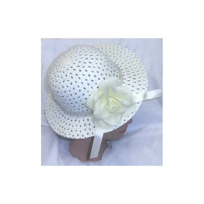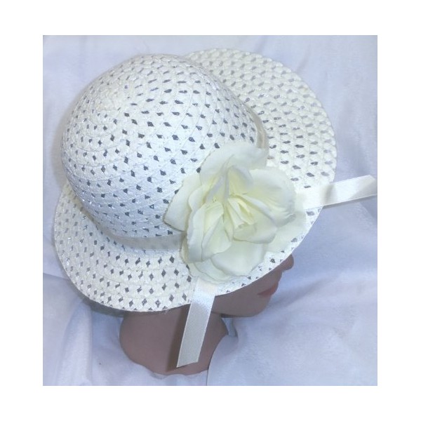 - Woven Cream Yellow Mesh Hat with Pink Accent Ribbon & Yellow Rose Flower