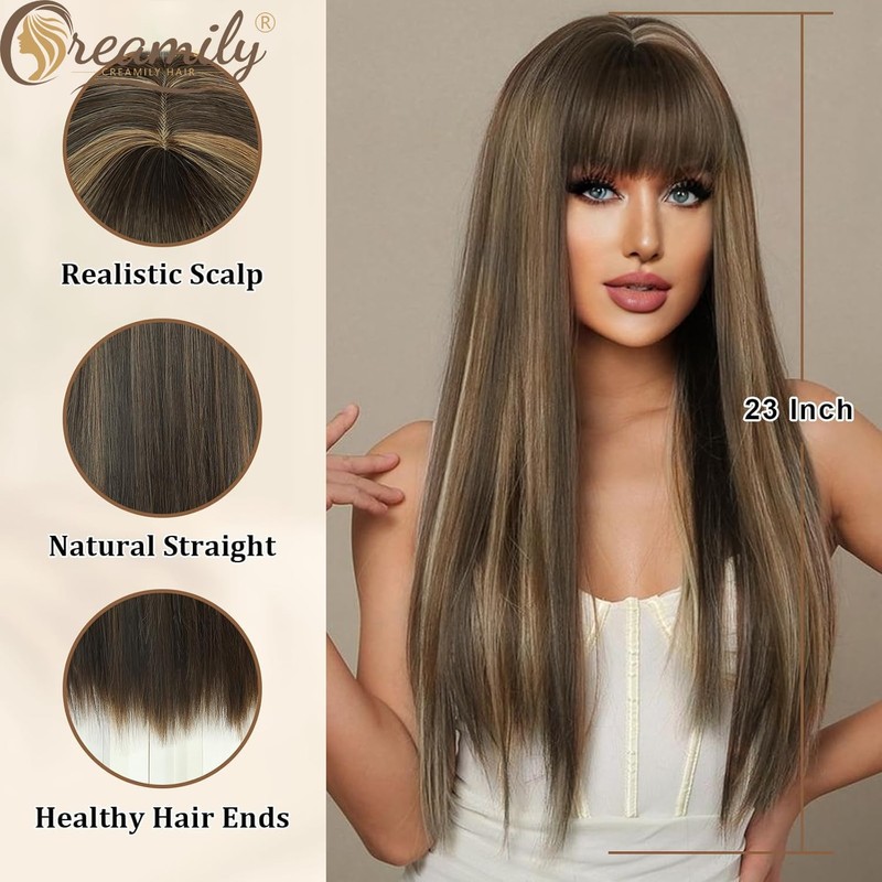 Creamily Long Brown Straight Wig with Bangs Ombre Brown Wig with Blonde Highlights 23'' Long Natrual Synthetic Hair for Women Party Daily Use